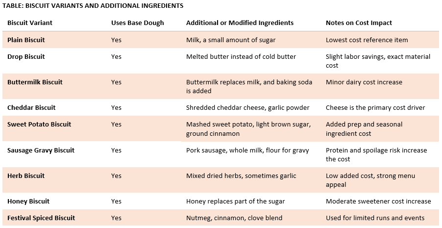 Across the bakehouses, inns, and contract kitchens supplied by the Waterdeep Trading Company, biscuits are treated as a controlled food product with a defined structure. They are not managed as separate recipes invented each morning. Instead, they are produced from a single base batch that anchors cost, supply planning, and pricing discipline. From that base, flavor and service variations are added in a controlled way.