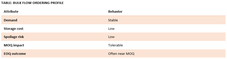 Bulk flow goods reward scale. Value-sensitive goods punish excess. MOQ is a constraint imposed from outside. EOQ is a choice made within the business.
