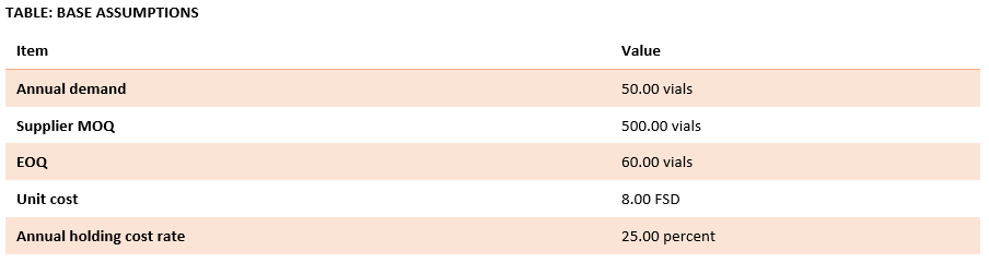 The following table summarizes the key assumptions for this scenario: annual demand is 50 vials, the supplier’s minimum order quantity (MOQ) is 500 vials, and the business’s calculated economic order quantity (EOQ) is 60 vials. Each vial costs 8 FSD, and the annual holding cost rate is 25%. By strategy, this ink is a value-sensitive product, making excess inventory a costly risk.