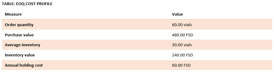 If the business could order at its preferred EOQ, the numbers reflect a lean approach: 60 vials per order, a purchase value of 480 FSD, and an average inventory of 30 vials. Inventory value stays at 240 FSD, with an annual holding cost of just 60 FSD. Cash exposure is limited, and inventory turns efficiently.