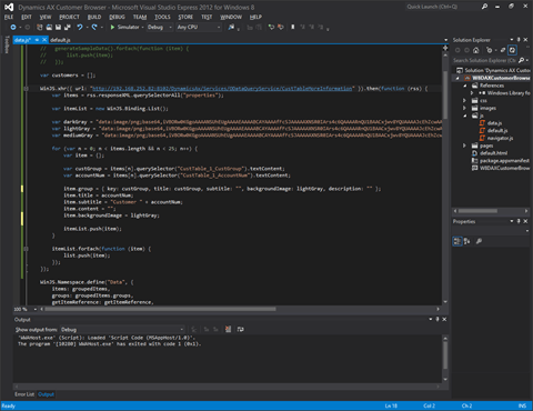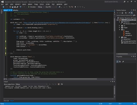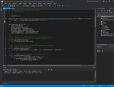 | If we look in the /js folder in the project that we just created, there is a snippet of code that populates the application with sample data. Rather than use the pre-canned data, we want to have AX data in the application. |