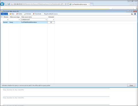 | Once you have activated the document source, you can then view all of the published queries by browsing to the ODataQueryService service: