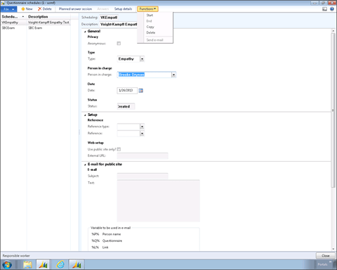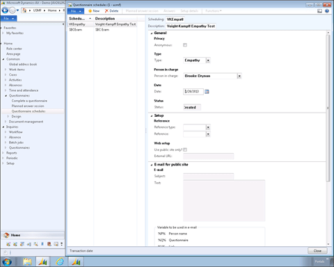 | As we create our Questionnaire Schedule we will assign it to someone to administer (in this case our HR Assistant) and assign it a release date. |
