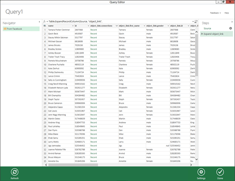 8. Power Query will now return back a subset of the data from Facebook as a test query.