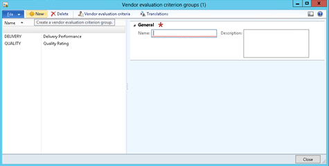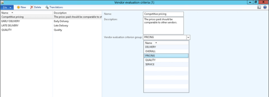 The first step in configuring the Vendor Ratings within Dynamics AX is to create some Vendor Evaluation Criteria Groups. These will be used to group common sets of evaluation criteria together and allow you to get summary results on the evaluations at the criteria group level.