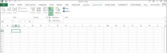 1. Start off by opening Excel, and from the Dynamics AX ribbon bar, select the Add Data option from the Design group.
