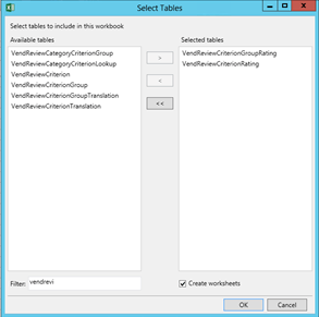2. Filter out the tables to just the ones that begin with VendReview* and select the following tables: