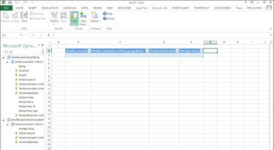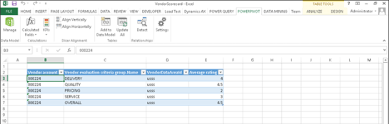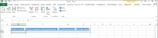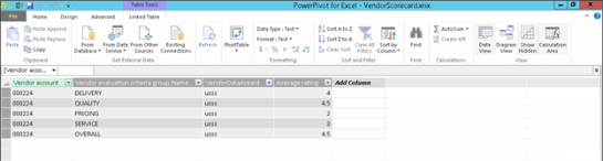 4. Select the VendReviewCriterionGroupRating tab that is created and add the Average rating field to the spreadsheet.