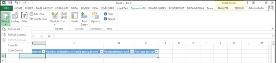 7. Then select the Refresh button in the Data group of the Dynamics AX ribbon bar, and select the Refresh All option.