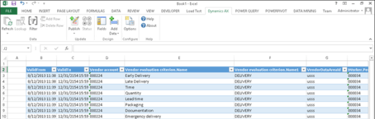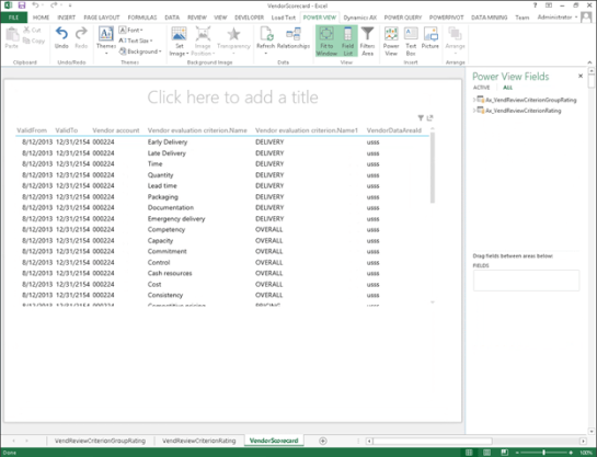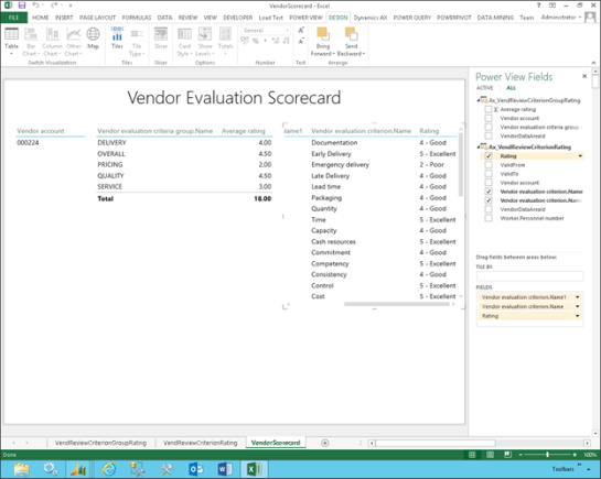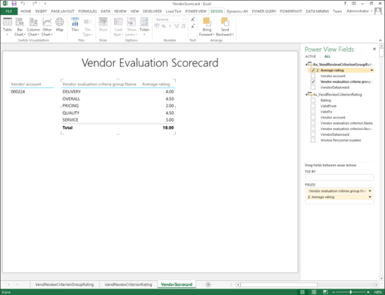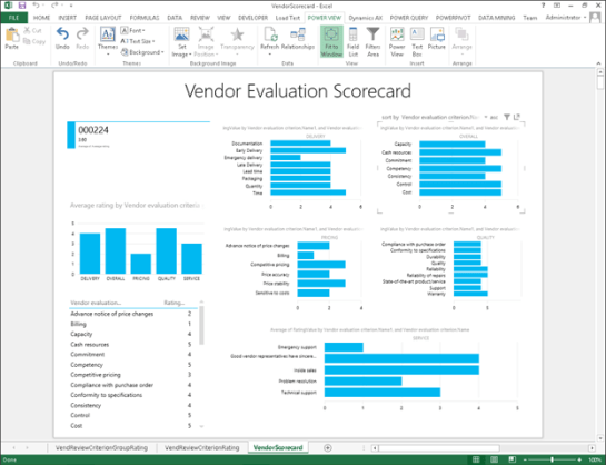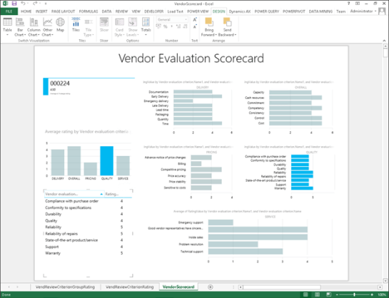Now that you have all of the vendor ratings recorded within Dynamics AX, you will probably want to generate a vendor evaluation scorecard. Rather than having a static report, why not do this through Power BI, and create some interactive dashboards that you can drill around in.