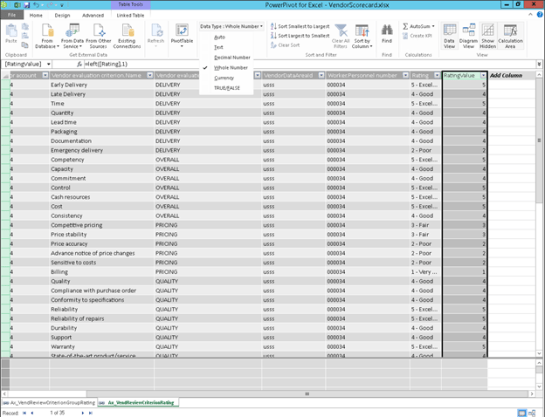 20. To report off the detailed ratings, we need to have the results as a number rather than the text selection that is used by default. To do this, open up the Power Pivot Model and create a new column called RatingValue on the VendReviewCriterionRating table.
