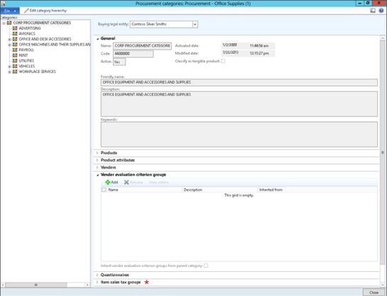 The final step in the setup process is to link the Evaluation Criteria with the Vendors within Dynamics AX. This is done through the Procurement Categories.