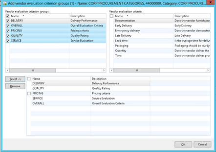 4. Select all of the Evaluation Criteria Groups that you want the vendors to be measured on, and click on the Select button to add them to the selection box.