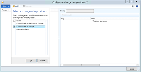 2. When the Configure exchange rate providers maintenance form is shown, click on the Add button in the menu bar, select the provider that you want to configure Dynamics AX to use, and then click the OK button.