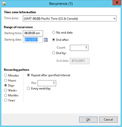5. Within the Recurrence dialog box, you can select the frequency of the batch process.