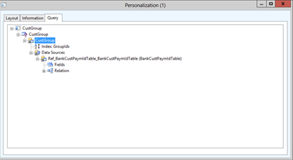 - When the Personalization form is displayed, select the Query tab. This shows all of the tables that are related to the form, and if you look at the first data source, then it is usually the table that you want to access.