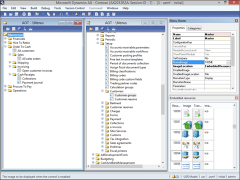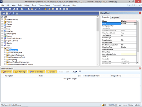 - Now right-mouse-click on the Master menu and select the Open New Window menu item and tile the windows so that you can see both the AOT tree and the menu. Then navigate to the menu items that you want to include in the Master menu and drag them over to the business process that they belong in. Keep on doing this for all of the menu items until your menu has all of the main business forms added to it.