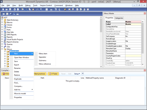 - Once you are in AOT, expand the Menu group so that you can see all of the menu area pages and then right-mouse-click on the Menus folder and click on the New Menu item to create a new menu for our master page.