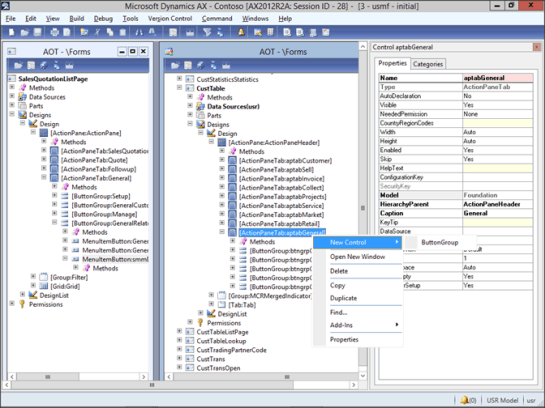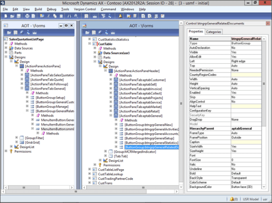 To add this to the Customers form as an example, open up the CustTable form and expand out the ActionPanel and then the General ribbon bar.Right-mouse-click on the ActionPanel and select the New Control menu item and then the ButtonGroup sub item.