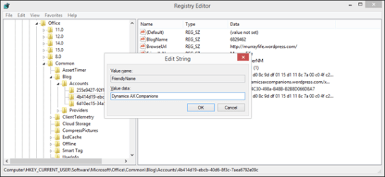 HKEY_CURRENT_USER\Software\Microsoft\Office\Common\Blog\Accounts