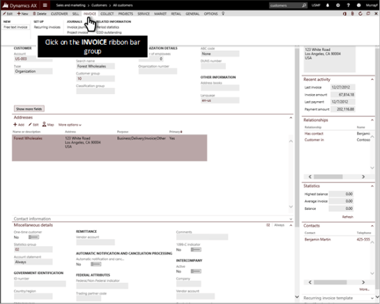 For example, while on the Customers record you can access all of the functions that are related to the invoicing by clicking on the INVOICE ribbon bar tab.