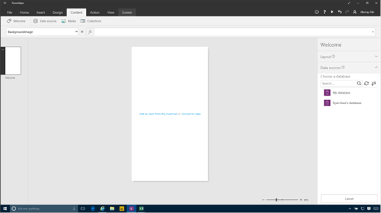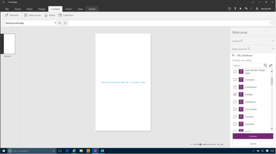 The next thing that we will want to do is to connect the application to the table within the Common Data Model. To do this all we need to do is click on the Content ribbon bar and we will see that there are a couple of options available for us.