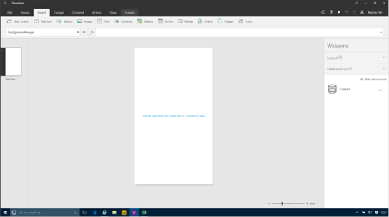 For this application we are going to start with a Welcome page with a link that then allows people to create new records within the Common Data Model entities. So the next step in the process is to add a second screen. To do this, click on the Insert ribbon bar, and then click on the New Screen button.