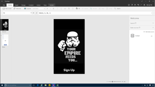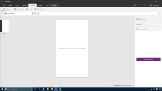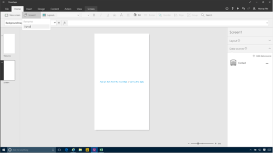 If we select the Screen1 page, and then look within the Home ribbon bar, we will see a button there with the same name. If we click on this button, a rename option will show up and we can change the name from the default name to something a little more useful. In this case we will set it to Welcome for the Welcome screen.
