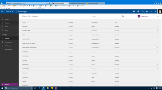 This will open up a list of all the entities that are available. In this case, these are all of the entities that are created when the Common Data Model database was created for us.