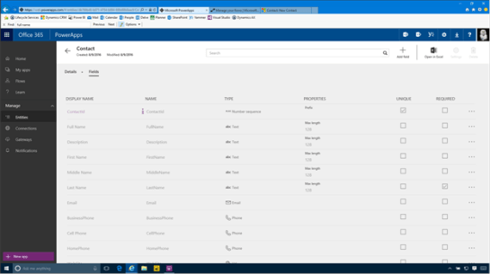 If we drill into the Contacts entity then we will be able to see all of the standard fields that are available for us to use within our applications.