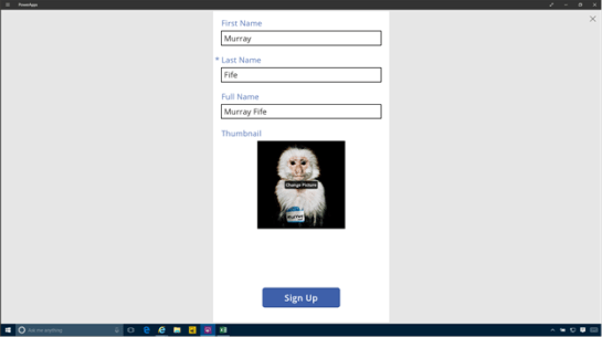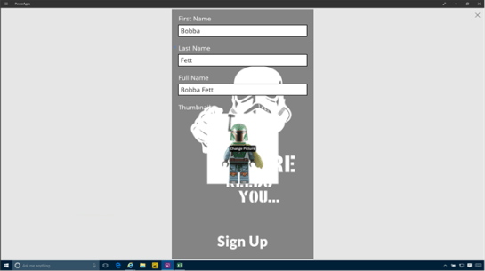 This will open up the Sign up form and we can fill in all of our details and add a picture before clicking on the Sign Up button to submit the record to the common data model entity.
