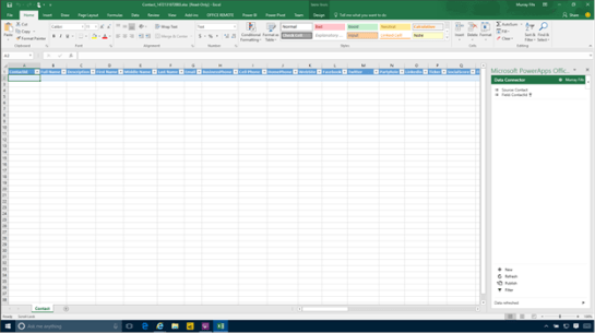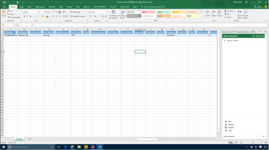 If we return to our Excel file that is linked to the Contacts entity and click on the Refresh button we will see that a new record has been added to the form.