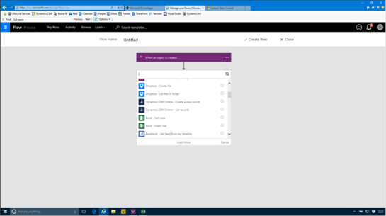 When the search box is displayed we can search through all of the actions that are available to us. These are different from the triggers and we can scroll down and find the Dynamics CRM Online – Create a new Record option.