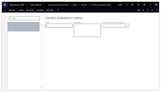 This will open the Vendor evaluation criteria maintenance form, and we will see that we don’t have any records yet.