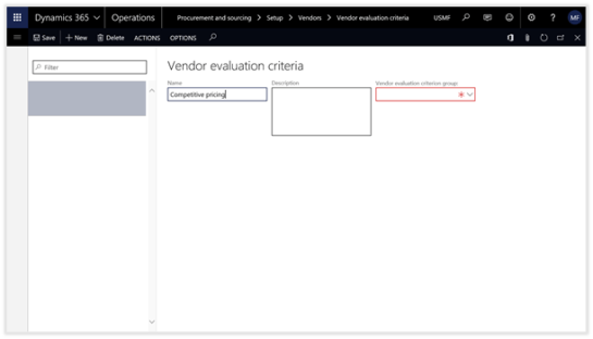 To add your first Vendor evaluation criteria record, just click on the New button on the menu bar.