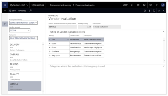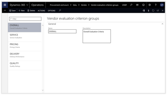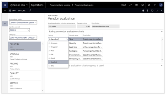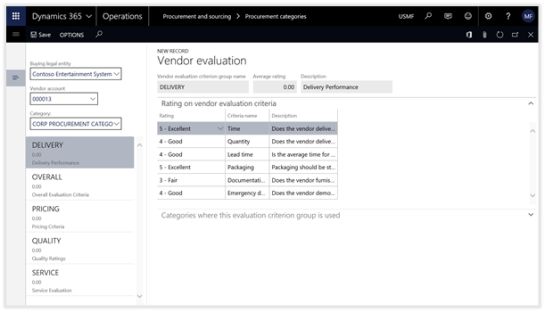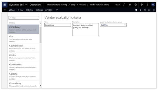 Dynamics 365 for Operations allows you to configure your own Vendor Evaluation Criteria and then track the vendor performance against any or all the criteria that you have defined.