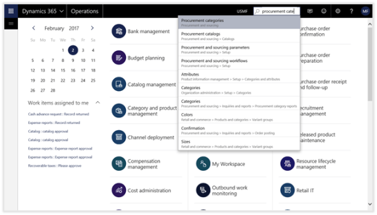 Alternatively, you can search for the Procurement categories form by clicking on the search icon in the header of the form (or press ALT+G) and then type in procurement cate into the search box. Then you will be able to select the Procurement categories maintenance form from the dropdown list.