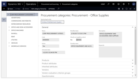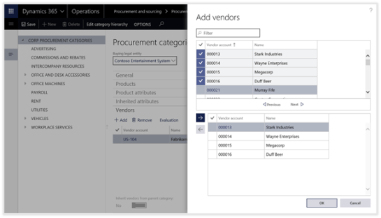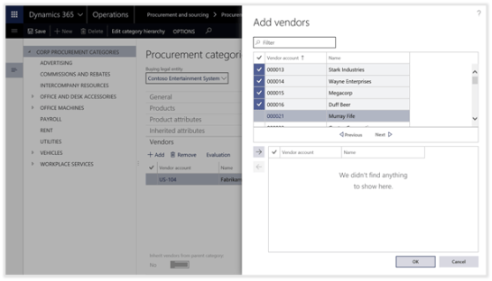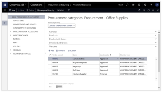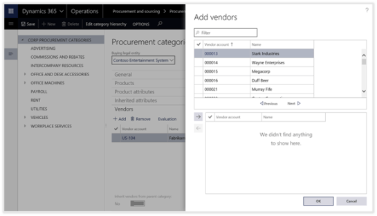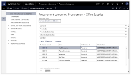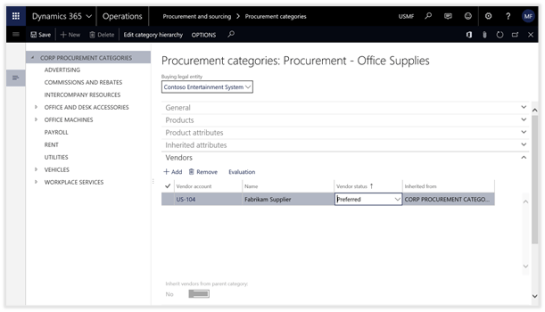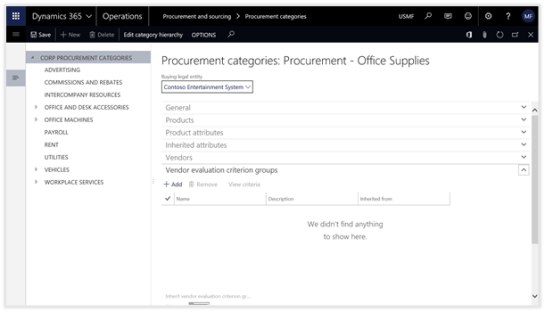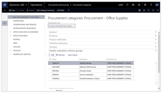 The final step in the setup process is to link the Evaluation Criteria with the Vendors within Dynamics 365 for Operations. This is done through the Procurement Categories.