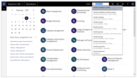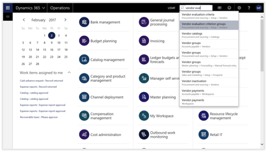 Alternatively, you can search for the Vendor evaluation criteria form by clicking on the search icon in the header of the form (or press ALT+G) and then type in vendor eval into the search box. Then you will be able to select the Vendor evaluation criteria maintenance form from the dropdown list.