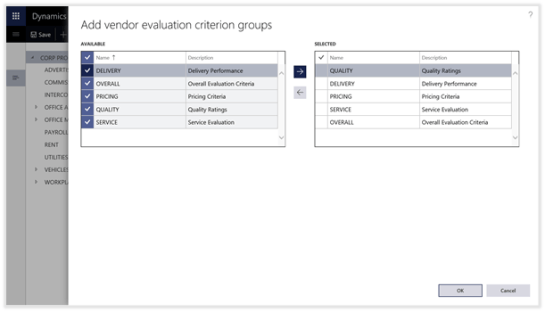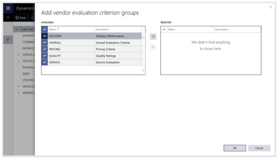 The Vendor Evaluation Criteria is a little hidden gem within Dynamics 365 for Operations. It allows you to start recording subjective ratings against the vendors and track the overall rating for the vendor based on performance.