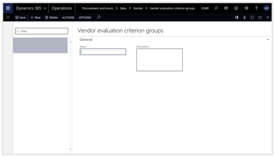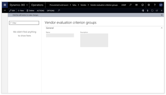 This will open the Vendor evaluation criteria groups maintenance form, and we will see that we don’t have any records yet.