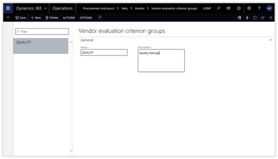 The first step in configuring the Vendor Ratings within Dynamics 365 for Operations is to create some Vendor Evaluation Criteria Groups. These will be used to group common sets of evaluation criteria together and allow you to get summary results on the evaluations at the criteria group level.