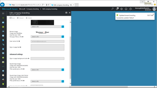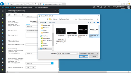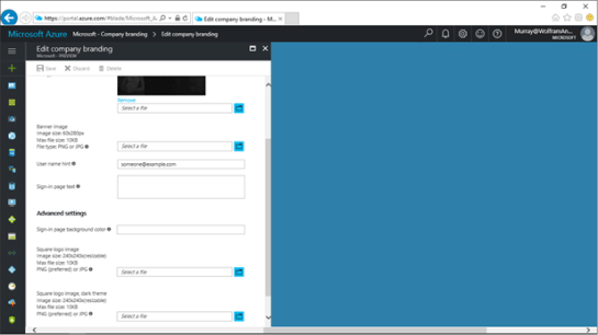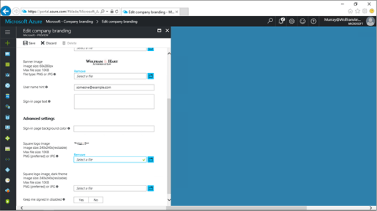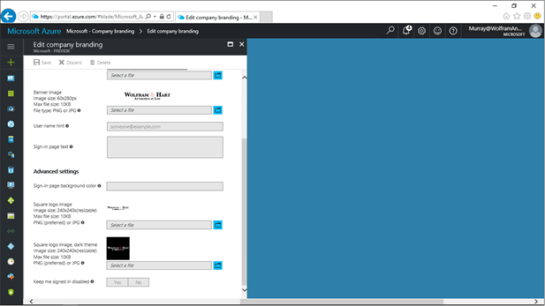 To do this, return back to the Azure Active Directory Company branding form. There are three more branding components that we can update including a banner image, and also a square logo image.