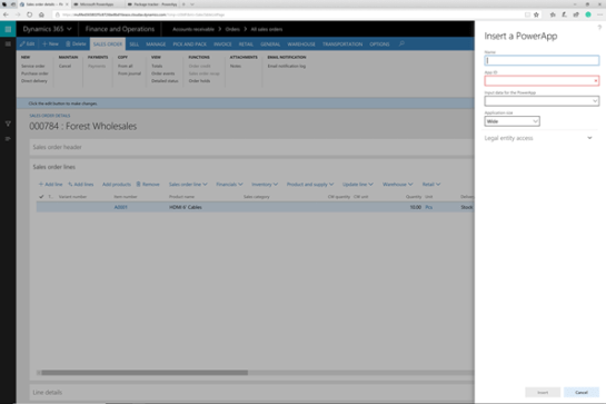 Now we will want to switch over to Dynamics 365 for Finance & Operations and click on the PowerApps icon within the menu bar and select the Insert a PowerApp button.