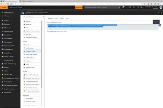 Now we will return back to our Azure portal and copy the connection string for the database that we just created.