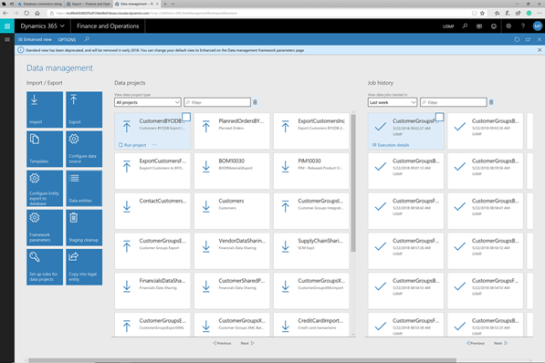 To do this we will want to open up the Data management workspace by clicking on the Data management tile on the home page of Dynamics 365.