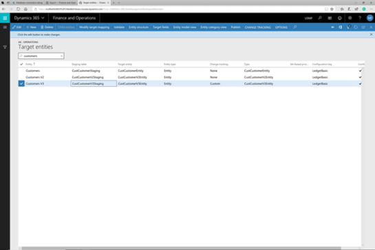 To do this we will open up the Target entities list and find the entity that we just created the full export for. In this case it’s the Customers V3 entity.