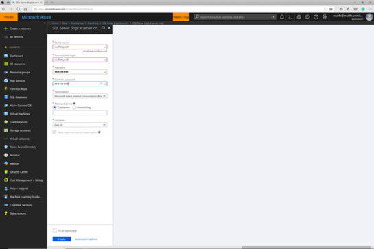 For this example we set the Server admin login to the same as the Server name to make it easier to remember.