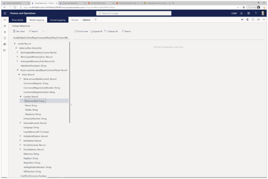 Now that we are in debug mode for the Electronic reporting, we can do a lot of different things, including browsing the data that is being returned from the data model, which is the data source for our Sales order confirmation.