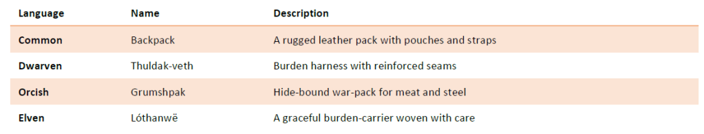 In Common, it’s just “backpack”—a rugged leather sack with straps and compartments. Functional, practical, and devoid of poetic flourishes. It’s what you’ll find listed in most adventuring kits and inventories. But dig deeper, and you’ll find other cultures give it more evocative names.